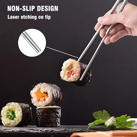 ✿ 【Kaymaz tasarım】 Metal yemek çubuklarımız kaymaz bir uca ve kare gövdeye sahiptir. Kolay kavranır ve yeni başlayanlar için uygundur. Paslanmaz çelik yemek çubuklarının ucundaki güçlendirilmiş lazer aşınma, metal yemek çubuklarını daha kolay kavrar ve kaymaz. Kare gövdeli metal yemek çubuklarının kullanımı kolaydır ve elde rahat tutulur.