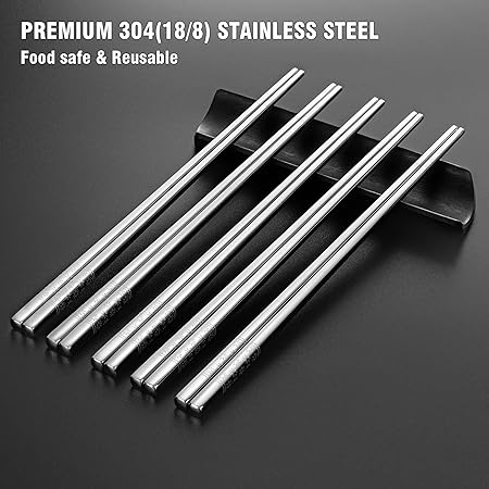✿ 【Yüksek kaliteli paslanmaz çelik 18/8】 Metal yemek çubuklarımız gıda maddelerine uygun 304 (18/8) paslanmaz çelikten üretilmiştir. Paslanmaz çelik 304, sık sık çatal bıçak takımları için kullanılan sağlıklı bir malzemedir. Paslanmaz çelik yemek çubuklarımızın her çifti 33 g ağırlığındadır, bu da sağlam kalite ve elde hoş bir his sağlar. Sağlıklı ve uzun ömürlü tekrar kullanılabilir yemek çubukları için en iyi seçim.