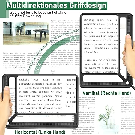 Geliştirilmiş sap tasarımı: Okuma büyütecimiz ergonomik olarak tasarlanmıştır ve tutamaklar, her iki tarafta tamamen tutulabilen bir kavrama elde etmek için geliştirilmiştir, bu da sürekli kullanımda rahat bir his sağlar. Büyüteçlerimiz dönüşümlü olarak sol ve sağ olarak da kullanılabilir, kişisel alışkanlıklarınıza göre doğru yönü (dikey veya yatay) seçebilirsiniz ve ayrıca kolay kaymayan güvenli bir tutuş için kaymaz bir bilek bandı ile birlikte teslim edilir.