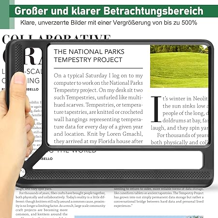 5 kat net büyütme: Okuma büyüteci, cam merceklerden daha hafif olan gelişmiş parlama yapmayan Fresnel lenslerden oluşur ve optik bozulma olmadan küçük baskıları %500 daha net büyütebilir. Bu sayede yaşlılar için küçük baskıları okumak, nesneleri kontrol etmek ve daha fazlası için idealdir.