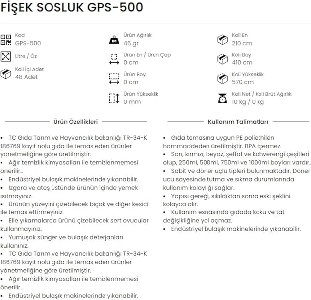 Dayanıklı Plastik Malzeme: Bu 500 ml’lik sosluk, uzun süre kullanım için yüksek kaliteli plastikten üretilmiştir.