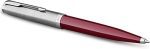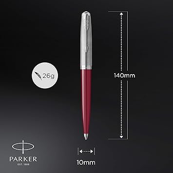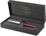 Uzun ömürlü, parıltılı burgonya kırmızısı değerli reçineden gövde ve paslanmaz çelik kaplamalı kapak ve süs parçaları ve tipik Parker yay oku klipsi