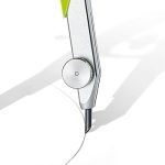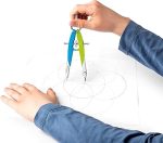 Eksen klavuzlu, yay başlı, merkez tekerlekli hassas geometri pergeli; sağlam plastik ve metal hammadden üretilmiştir