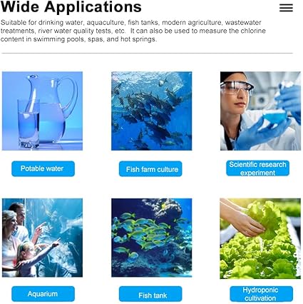 【Geniş Uygulamalar】: İçme suyu, su ürünleri ştiriciliği, balık tankları, modern tarım, atık su arıtma, nehir suyu kalite testleri vb. için uygundur. Ayrıca yüzme havuzlarında, kaplıcalarda ve kaplıcalarda klor içeriğini ölçmek için de