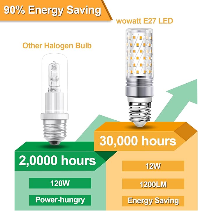 【Enerji tasarrufu】Bu 12 W E27 LED lambalar geleneksel 120 W halojen veya ampulün yerine geçebilir, %90’a kadar elektrik tasarrufu sağlar. Yüksek parlaklık ve düşük güç tüketimi sunar. Kullanım ömrü 30,000 saattir, bakım ve kullanım maliyetlerini önemli ölçüde azaltır.
