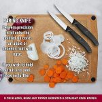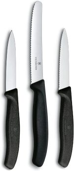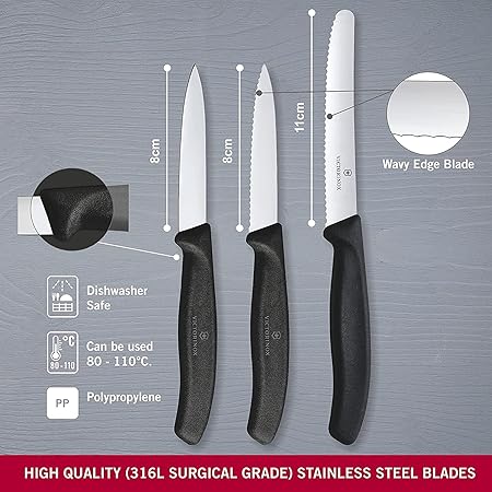 3’lü set düz kesimli bir sebze bıçağı, 8 cm, tırtıklı ve orta sivrili bir sebze bıçağı, 8 cm ve 11 cm dalgalı kesimli bir domates bıçağından oluşur
