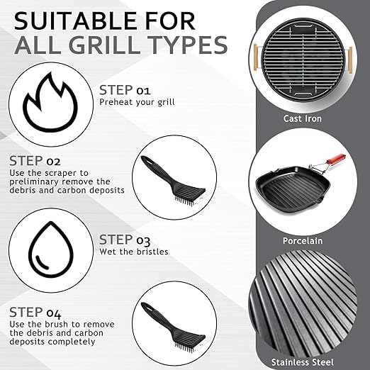 Çeşitli Barbekü Türleri için Uygun: Izgara fırçalarımız kömür, porselen, seramik, kızılötesi vb. gibi çeşitli ızgaralar için uygundur, pratik tasarımı yağ ve inatçı kalıntıları hızla gidermeye yardımcı olur ve ızgarayı kolayca temiz tutmanızı sağlar