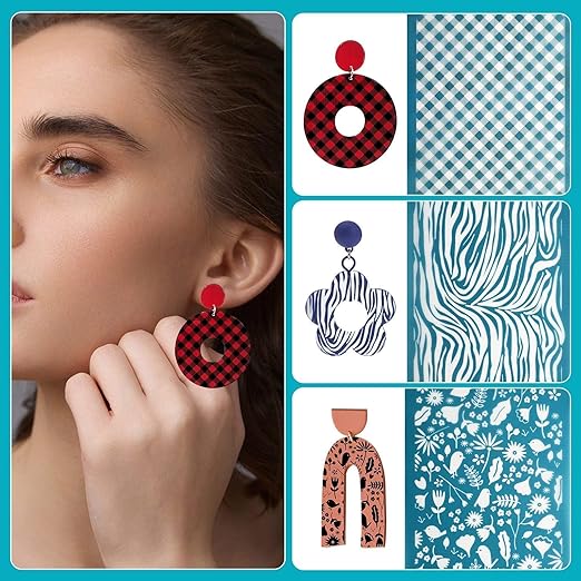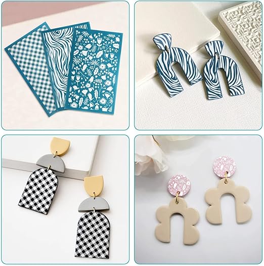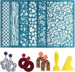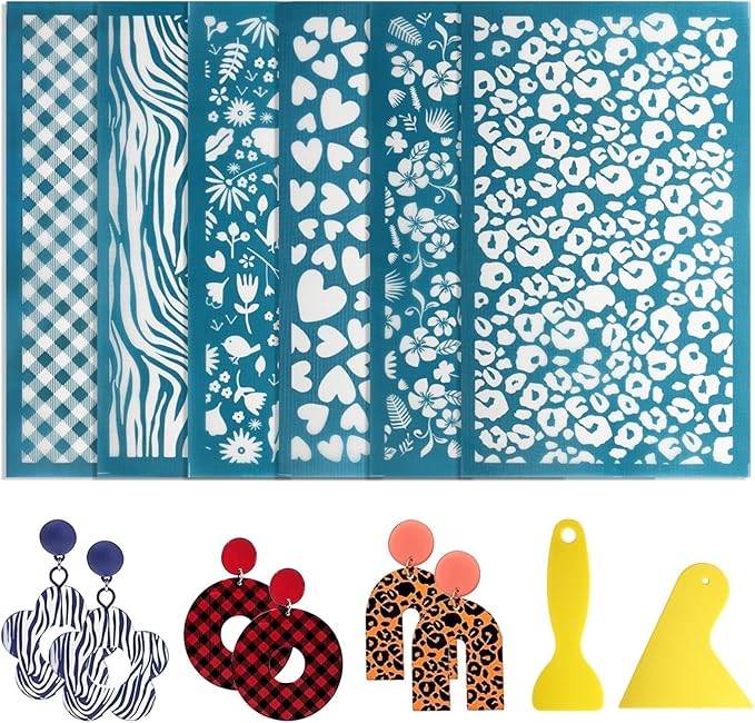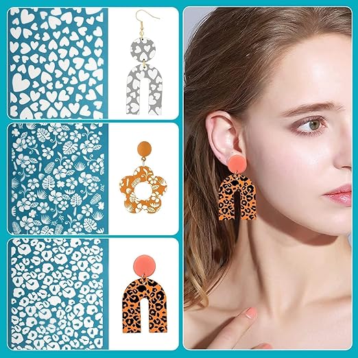 6 Benzersiz Tasarım: Çita baskısı, zebra baskı, yapraklar, çiçekler, kalp, retro desen dahil polimer kil küpe yapımı için 6 stil serigraf şablonu