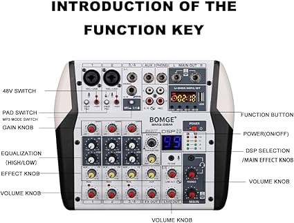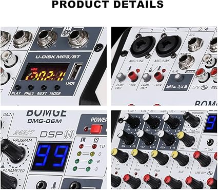【Çok Yönlü 6 Kanallı Ses Mikseri】: 6 kanallı ses tahtamız, evde müzik prodüksiyonu, canlı yayın, karaoke, ses kaydı ve küçük grup ları iç tasarlanmış çok işlevli b cihazdır. Dahili ses kartı ve BMG tasarım efekt çipiyle donatılmış olup, tüm ses ihtiyaçlarınız iç li ses sunar.
