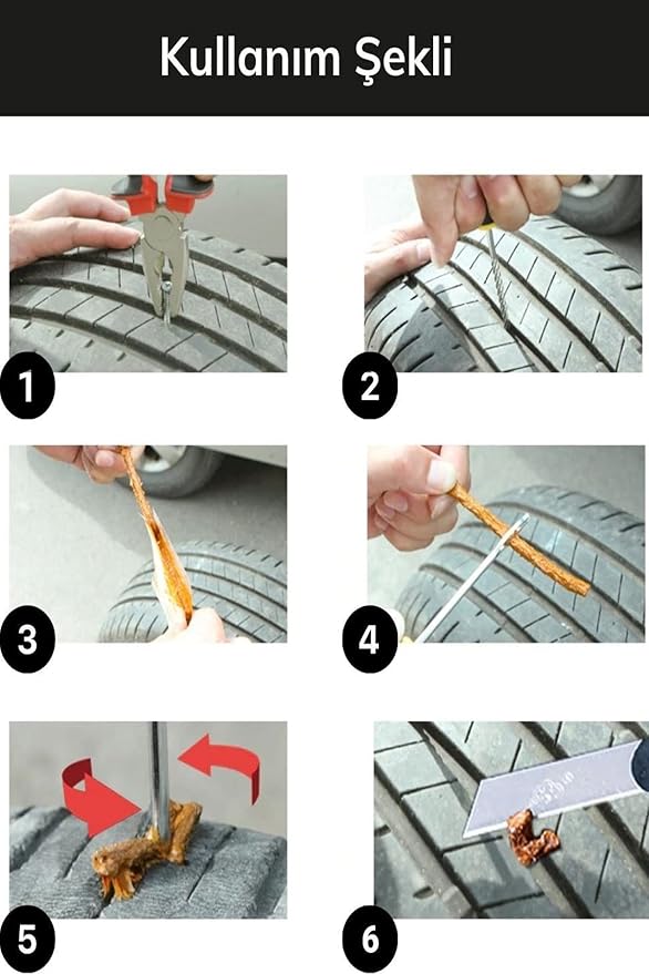 6 Parça Lastik Tamir Seti olmadanÖnlem almadan yola çıkmayın!Pratik Taşınabilir Patlak Lastik Tamir Onarma Kiti Seti Aparatı Özellikleri:Acil durumlarda lastik tamiri için tasarlanmıştır