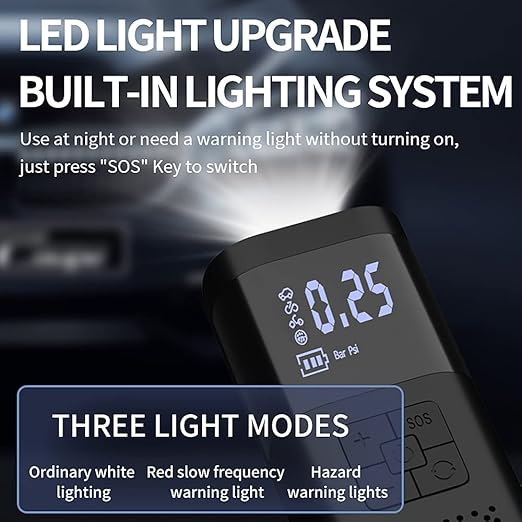 3.LCD ekran ve LED el feneri: elektrikli lastik pompası, daha net ve daha parlak olabilen dijital ekranlı geniş bir LCD ekrana sahiptir. Bu hava pompası yalnızca arabanızı şişirmekle kalmaz, aynı zamanda nuzu şarj eder ve bir meşale görevi görür. . Torcun üç modu vardır (aydınlatma, flaş, SOS), her kullanımdan sonra, soğuduktan sonra en az 15 dakika beklemeniz ve ardından kullanmaya devam etmeniz önerilir.
