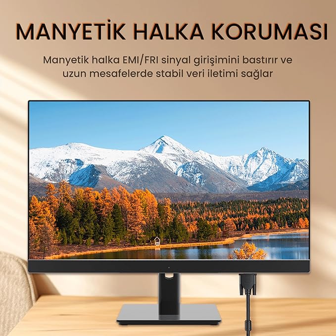 VGA arayüzüne sahip projektörler, monitörler, televizyonlar, dizüstü veya kasalı bilgisayarlar ile tam uyumlulukta çalışarak size geniş bir uyumluluk sunar. Üzerinde bulunan iki adet manyetik halka sayesinde dış faktörlerden kaynaklanan parazitleri tamamen engeller. Altın kaplama konnektör uçları ve PVC malzeme ile üretilen dış kaplama kablonun kullanım ömrünün çok uzun süre olmasını sağlar.