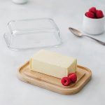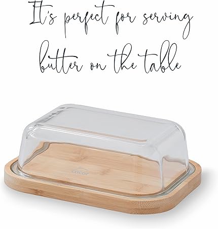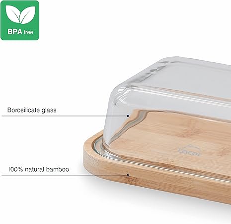 %100 doğal bambu bazlı kap, tereyağı depolama, sunum ve kesme için. Yüksek kaliteli borosilikat camdan kapak.