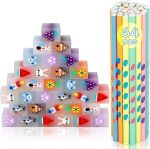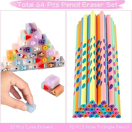 64 ADET Yenilik Kalem ve Kauçuk Seti, Çocuklar için 32 Sevimli Kauçuk Silgi ve Çocuklar için 32 Üçgen Kalem, Eğlenceli Kırtasiye Seti Okul Sınıfı için Harika Olur (Üçgen Kalem)