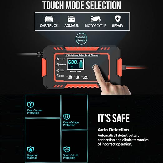 Her türlü araç için uygundur ✍ 6 Amper akü şarj cihazı, her türlü AGM, Jel, SLA, su basmış (WET), kalsiyum derin döngü akülerinin bakımı ve şarjı için, motorlu araçlar veya deniz araçları için 4 Ah-100 Ah – 12 V akülerin bakımı ve şarjı için. Darbe onarım fonksiyonu pil kaybını onarmanıza ve pil ömrünü uzatmanıza yardımcı olabilir. Tüm yıl boyunca akü bakımı veya uzun süreli saklama sırasında araçlarınızı tam şarj ve bakım sağlamak için mükemmeldir