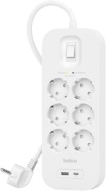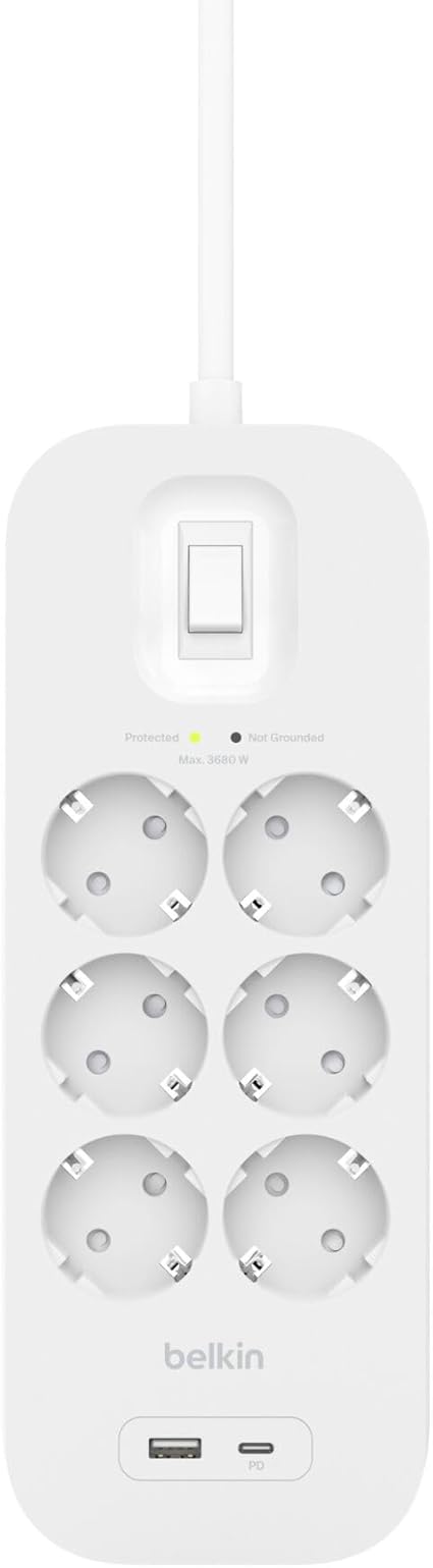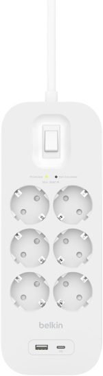 6’lı çoklu priz, yüksek gerilim korumalı, duvara montaj, 6 priz, 2 m güç kablosu, yeşil ışıklı gösterge, hızlı şarj için USB-C ve USB-A bağlantısı; 650 jul koruma