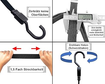 ✅【Bagaj germe seti】2 x germe lastiği 30 cm ve 4 x germe lastiği 60 cm. Bagaj germe seti kolayca kombine edilebilir. Sertleştirilmiş çelik kancanın yüzeyi, motosikletinizi veya bisikletinizi çizilmelere karşı koruyan kalın bir plastik kabuk ile sarılmıştır.