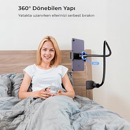 Çok Yönlü Kullanım Bu esnek tablet tutucu, 360 derece dönebilen başlığı sayesinde hem yatay hem dikey kullanıma uygundur. Kaymaz tablet tutucu özelliği ile cihazınızı güvenle tutarken, 70 cm uzunluğundaki esnek gövdesi sayesinde istediğiniz pozisyonda kullanabilirsiniz.