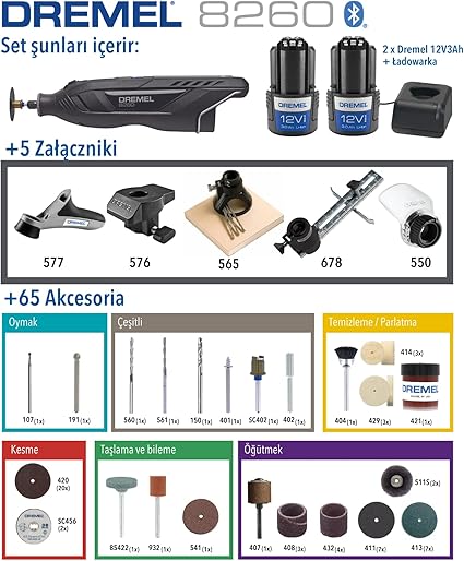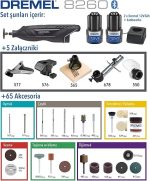 8260 Dünyanın Akıllı ve Fırçasız Motorlu İlk Çok Amaçlı El Motoru, 2×12 V 3 Ah Lityum İyon Akü, 5 Bağlantı Parçalı, 65 Aksesuarlı