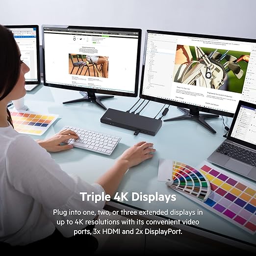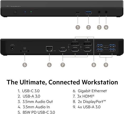 85W Güç Dağıtımlı Üçlü 4K Ekran için 3 HDMI Bağlantı Noktası, 2 DisplayPort, Gigabit Ethernet, 3,5 mm Mikrofon/Hoparlör, 1 USB C ve 5 USB A Bağlantı Noktalı