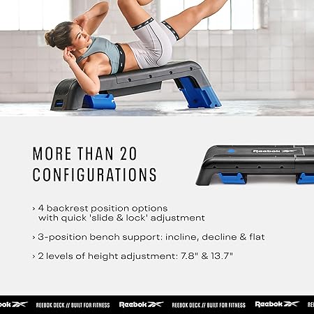 Her türlü antrenman için ideal, platform eğim, eğim ve düz tezgah yapılandırmalarına sahip tamamen uyarlanabilir bir platformdur, sırtlığı dört ayarlanabilir pozisyonda eğme yeteneği dahil. Tahta ayrıca yoğunluğu daha da artırmak ve egzersiz olanaklarınızı çeşitlendirmek için iki kademeli yükseklik ayarı (20 ve 35 cm) sunar. Başlamayı kolaylaştırmak için ücretsiz çevrimiçi video antrenmanlarına erişebilirsiniz, böylece yeni Reebok Deck’inizden en iyi şekilde yararlanabilirsiniz.