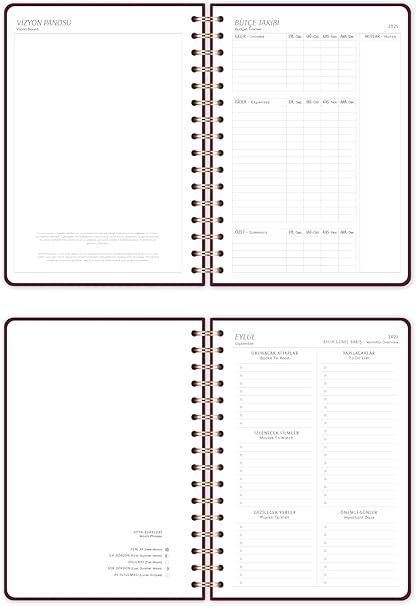 Fonksiyonel Sayfa Tasarımı – Her Ay ve Haftaya Özel Bölümler: Aylık genel bakış, yapılacaklar listesi, ay evreleri, kitap/film listesi ve haftalık plan sayfaları ile detaylı organizasyon sağlar.