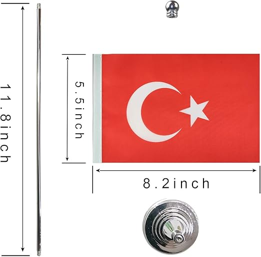 Malzeme: Bayrak yüzeyi dayanıklı polyester, gümüş metal çubuk, süet kaymaz stand tabanından yapılmıştır