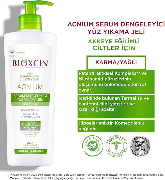 İçeriği Acnium Patentli Bitkisel Kompleks (Çay Ağacı Yağı, Zerdeçal, Karnabahar, Brokoli Ekstresi ve Gözotu Ekstresi): Bitkisel ekstre cilt pürüzlerine karşı klinik olarak test edilmiştir. Hazırlanan formül cilt pürüzlerine yol açan faktörleri bloke eden bir etkiye sahiptir. Niasinamid: Cildin sebum dengesini düzenler. Mat bir görünüm sağlar. Termal Su: Cildin doğal nemlendirme mekanizmalarını uyarır