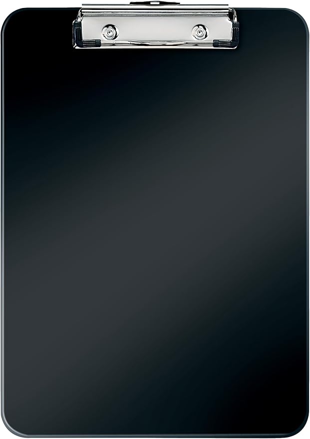 Parlak yüzeyli siyah sıkıştırma tahtası, yuvarlatılmış kenarlı tasarım, 80 A4 yaprak (80 g/m²) alır, kullanımı kolay, ergonomik şekil, evde ve ofiste kullanım için