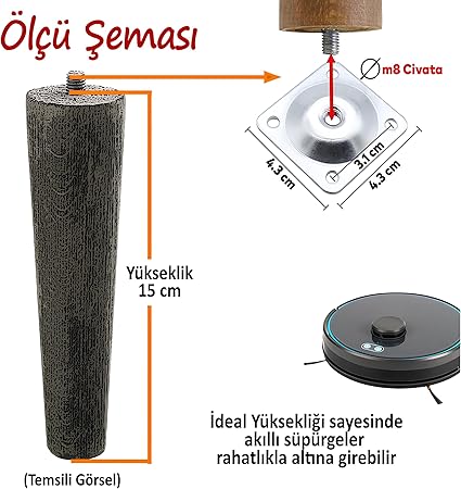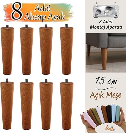 ADET Ahşap Ayak 15 Cm Açık Meşe M8 Civatalı Bağlantı Aparatlı Dolap Mobilya Koltuk Kanepe Destek Ayağı Ayakları