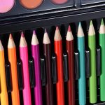 Renkli kalemler, yağlı pasteller, sulu kalem, fırçaları, kurşun kalemler ve diğer kullanışlı aksesuarlar dahildir.