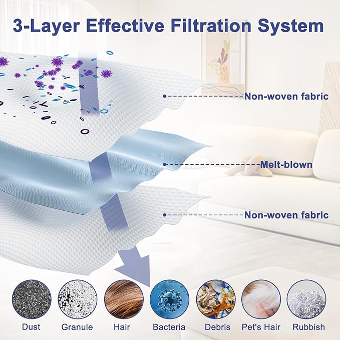 【Temiz hava için yüksek verimli filtreleme】 Toz torbası, eritilerek üflenmiş liflerden ve sadece 0,3 mikron boyutundaki toz parçacıklarının %99,9’undan fazlasını bloke eden yüksek kaliteli dokusuz kumaştan oluşan 3 katmanlı bir filtreye sahiptir. Böylece havanız daha temiz olur ve eviniz tozsuz kalır, alerjisi olanlar için de