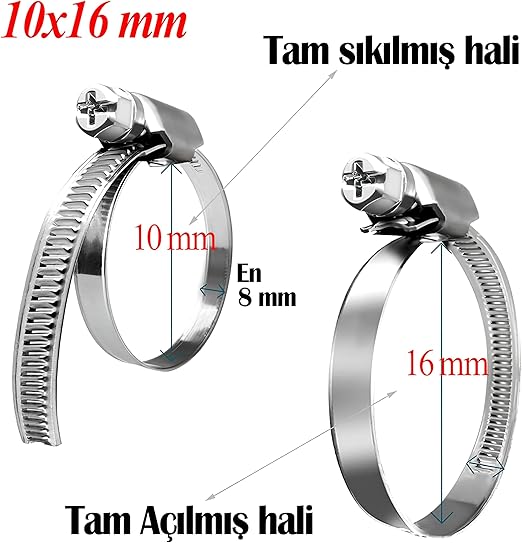 ADET Hortum Kelepçesi Tork Ayarlı 10×16 mm Paslanmaz Çelik Boru Metal Kelepçe Ayarlanabilir Klips