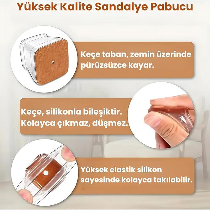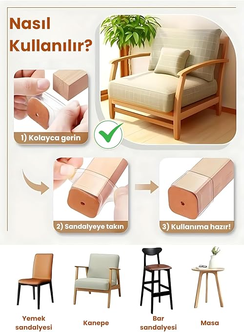KORUMA ÖZELLİĞİ: Şeffaf silikon sandalye ayak koruyucuları, mobilyalarınızı ve zeminlerinizi çizilmelere ve aşınmalara karşı etkili şekilde korur
