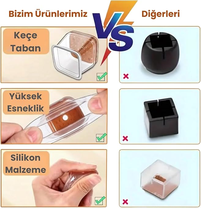 SET İÇERİĞİ: Paket içeriğinde 12 adet şeffaf silikon kare sandalye ayak koruyucusu bulunur, tüm mobilyalarınız için yeterli sayıda koruma sağlar
