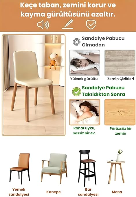 MALZEME ÖZELLİKLERİ: Keçe tabanlı tasarımı sayesinde zeminde kaymaz, mobilya hareketlerinden kaynaklanan sesi minimize eder