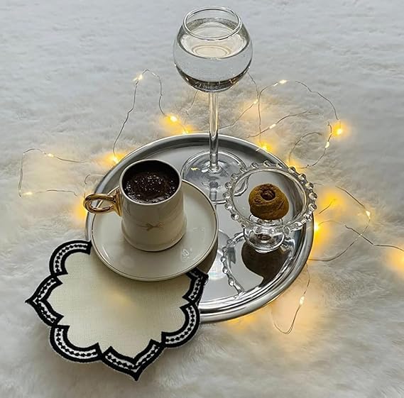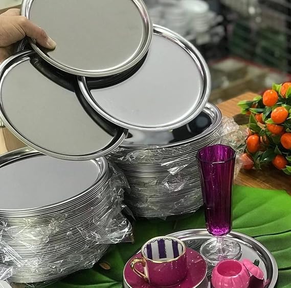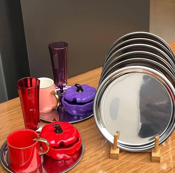 Adet Lüx Gümüş Paslanmaz Çelik Yuvarlak Çay,Kahve,Pasta Servis Tepsisi Sunum Tepsisi 21.5 cm