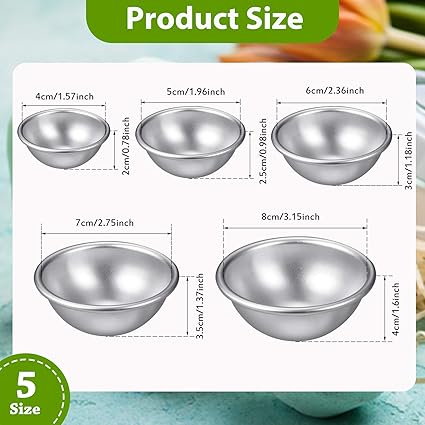 Ürün bilgileri: Paket, 4 cm, 5 cm, 6 cm, 7 cm ve 8 cm çapında, boyut başına 2 parça, yeterli miktar ve çeşitli boyutlar dahil olmak üzere 5 farklı boyutta 10 adet metal banyo bombası kalıbı ile birlikte gelir, çeşitli kendin yap el sanatları yapım ihtiyaçlarınızı karşılayabilir