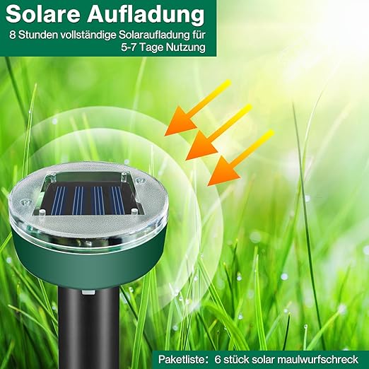 【Güneş enerjisi】 Köstebek kovucu entegre yüksek teknoloji güneş paneli, doğrudan güneş enerjisi ile şarj edilebilir, ek pil gerektirmez, çok enerji tasarruflu, pratik ve çevre dostudur. Köstebek kovucu 5 – 7 gün boyunca kesintisiz çalışabilir, yağmurlu veya bulutlu günlerde normal çalışma sağlamak için güneşte sadece 8 saat tam şarj olur.