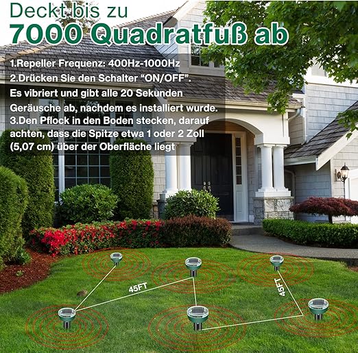 【İnsanlar ve evcil hayvanlar için zararsız】Köstebek korkutucu her 20 saniyede bir nabız atar, 400 Hz-1000 Hz akustik darbeler ve titreşimler gönderir. Böylece fare, köstebek, tarla faresi ve yer sincapları gibi hayvanları uzaklaştırmak için farenin merkezi sinir sistemi uyarılır. Fareleri yaralamadan tarla faresi korkutucu ve çevre, insan ve hayvanlar için güvenlidir.