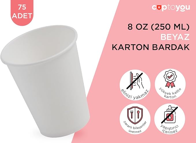 Bardaklarımız, kaynar su ile temas ettiğinde toksik madde salmayan zararsız karton ve laminasyondan yapılmıştır ve tüketicilerin güvenliğini sağlar
