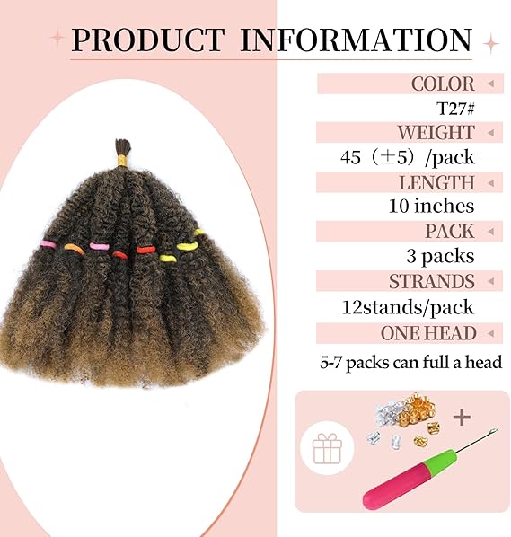 Paket detayları: Afro kinky twist hair 10 inç yaklaşık 45 g/paket; 14 inç yaklaşık 55 g/paket, 12 kök, beyaz tığ ve bazı boncuklar, genellikle 6 – 8 paket tam bir kafa olabilir.
