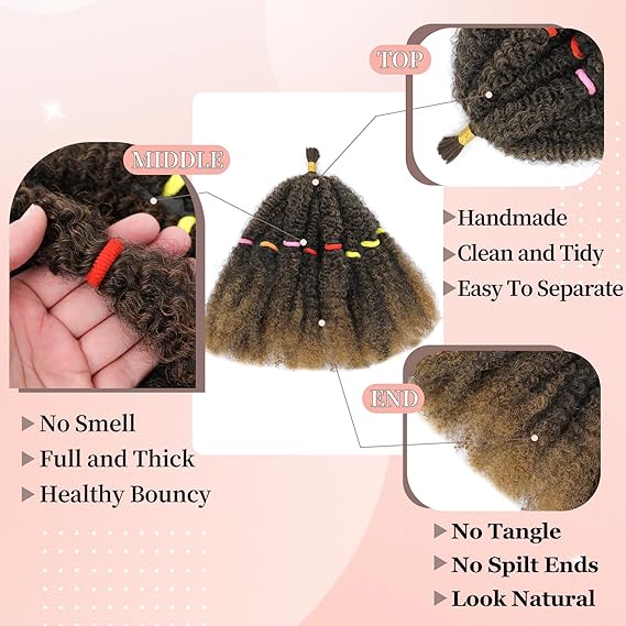 Saç malzemesi: Afro kinky saç, yüksek kaliteli düşük sıcaklık fiber sentetik saçtan yapılmıştır. Kıvrımlı saç, el yapımı tığ örgüleri;