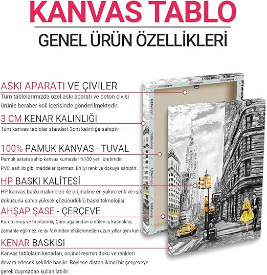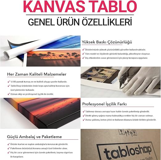 Tüm kanvas tablolarımızda 370gr/m2 %100 pamuk astarlı birinci sınıf sanatsal kanvas kumaşlar kullanılmaktadır. Sağlığa zararlı madde bulunmamaktadır. PVC, asit veya herhangi bir kanserojen madde içermez. %100 pamuktan üretilen kanvas kumaşlar, uzun yıllar boyunca dayanıklı bir biçimde ürününüzü kullanmanızı sağlar. Tüm kanvas tablolar profesyonel işçilik ile hazırlanır.