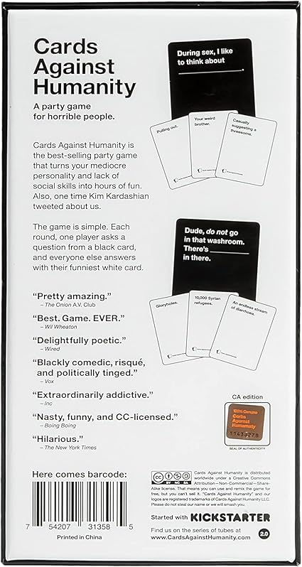 Sonsuz tekrar oynanabilirlik için 500 beyaz kart ve 100 siyah kart ile birlikte gelir.