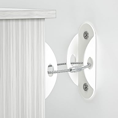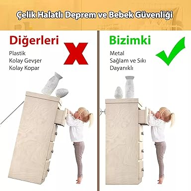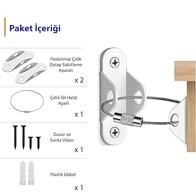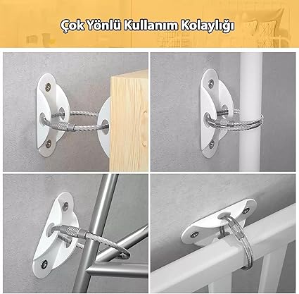 Ağır Yük Çelik Halatlı Eşya Sabitleyici Aparat – Bebek Koruyucu ve Çocuk Güvenliği Deprem Mobilya Devrilme Düşme Önleyici – Masa Şifonyer Duvara Sabitleme Aparatı – Beyaz Renk