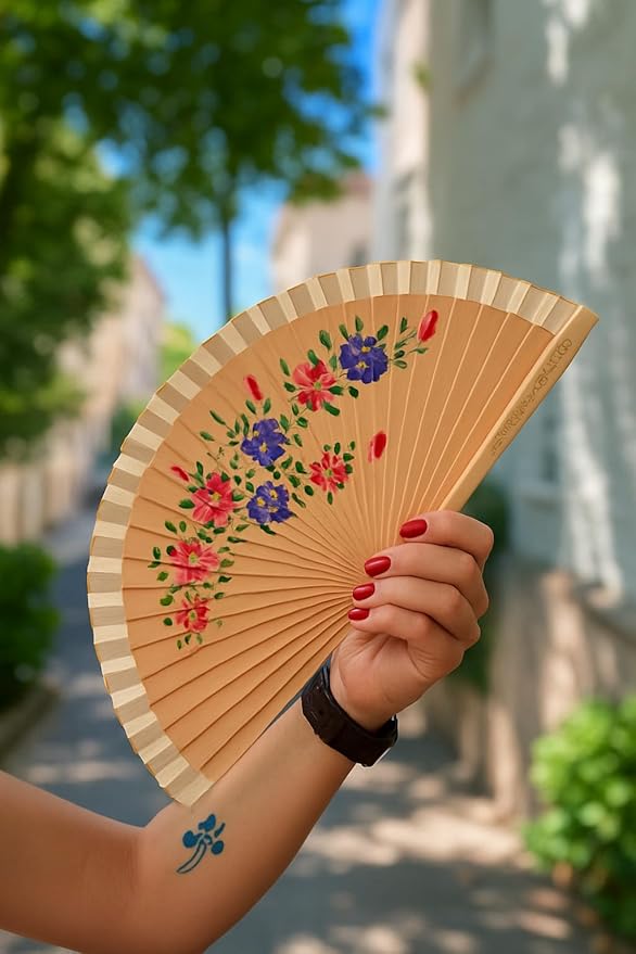 Ahşap Görünümlü Katlanabilir El Yelpazesi Mor Kırmızı Çiçek Desenli Dekoratif Geleneksel Yelpaze 40×22 cm Ahşap Saplı Şık Tasarım