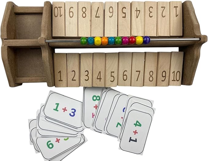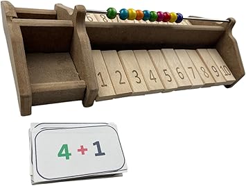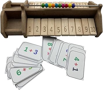 ÖĞRENME SETİ: Ahşap yapılı matematik öğrenme seti, renkli boncuklu abakus ve toplama işlemi kartları içerir