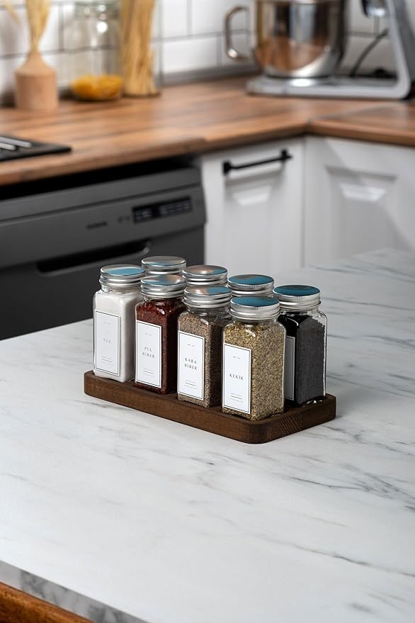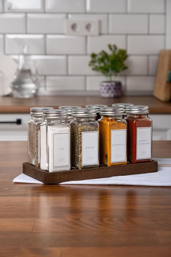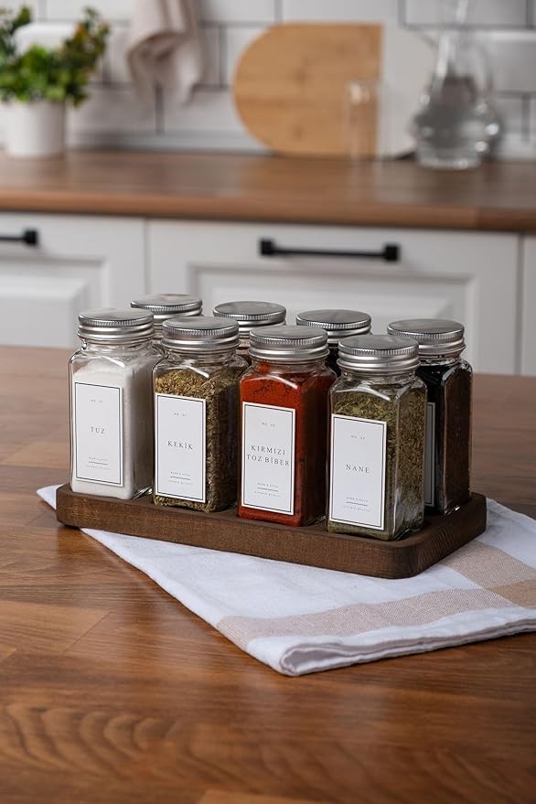 Ahşap Standlı Cam Baharatlık Seti Gümüş Kapaklı Beyaz Etiketli Baharatlık Takımı