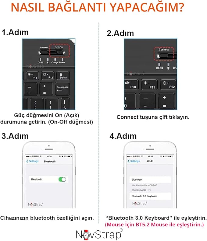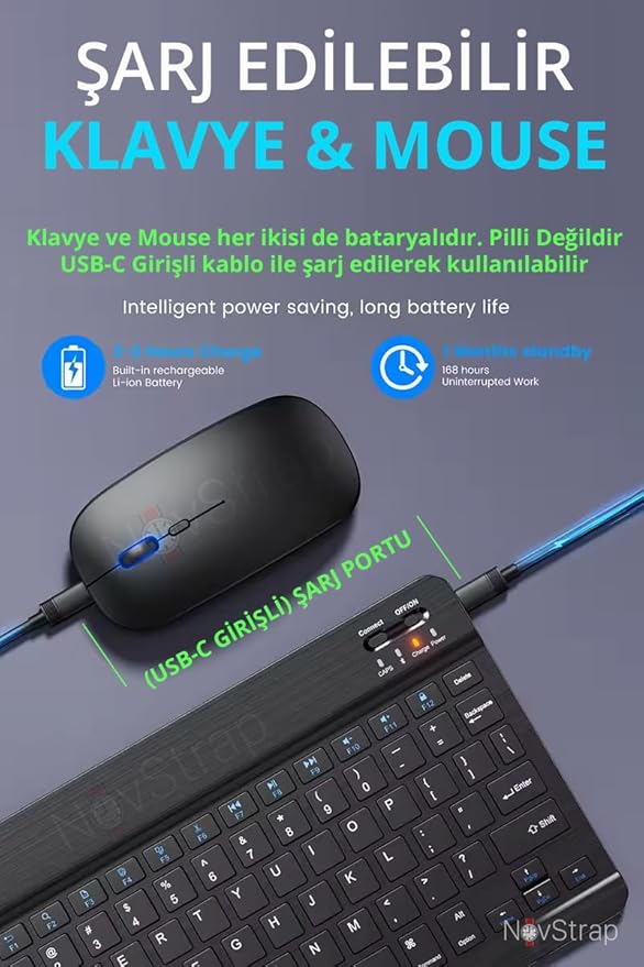 PAKET İÇERİĞİ; 1 Adet Bluetooth Klavye; 1 Adet Bluetooth Mouse, 1 Adet Şarj Kablosu;